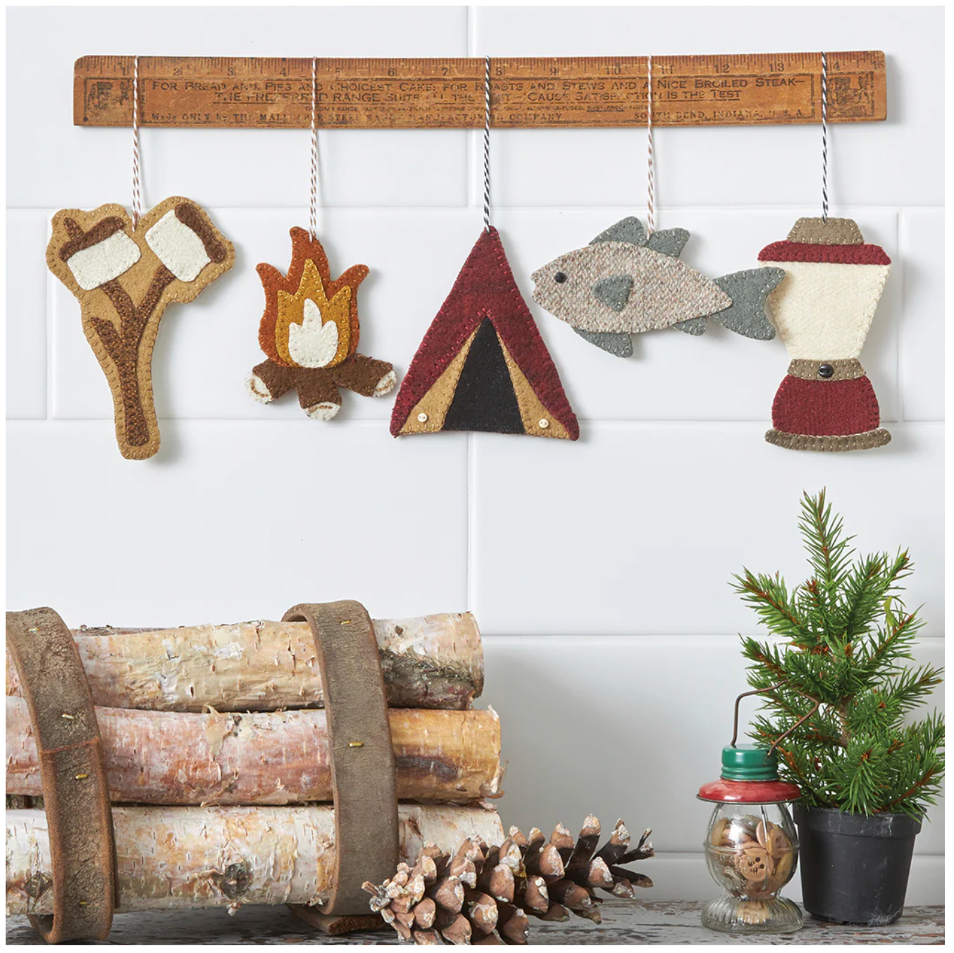 Make these 5 fun "campy" ornaments! The wool applique ornaments are perfect to hang from a shelf or tree you keep out all year long!