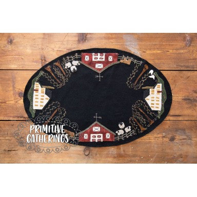 Summer On The Farm is a wool appliqué table mat that has barns, houses, sheep, cows, chickens, and trees on it.